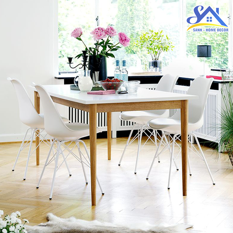 Bên dưới, là bộ bàn ghế ăn hiện đại của Nội Thất Nhà Sành sản xuất với set 1 bàn ăn + 4 ghế Gỗ cao cấp. Ghế có nhiều màu sắc giúp bạn lựa chọn phù hợp với không gian ngôi nhà bạn.