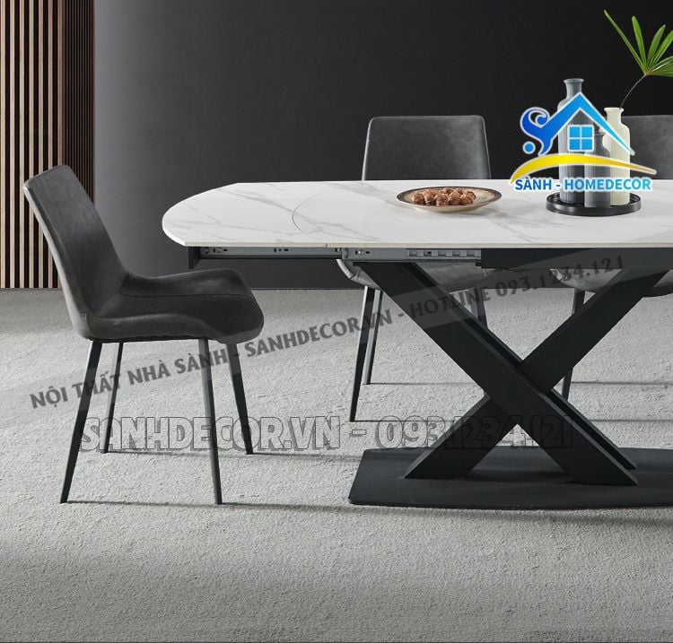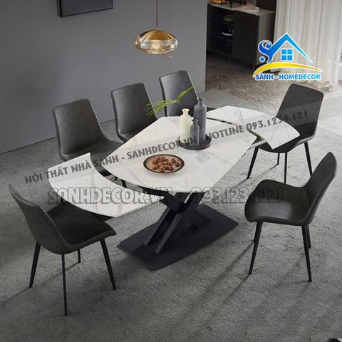 | Chất liệu | Bàn ăn mặt đá cao cấp, chân sắt sơn tĩnh điện, ghế bọc nệm |