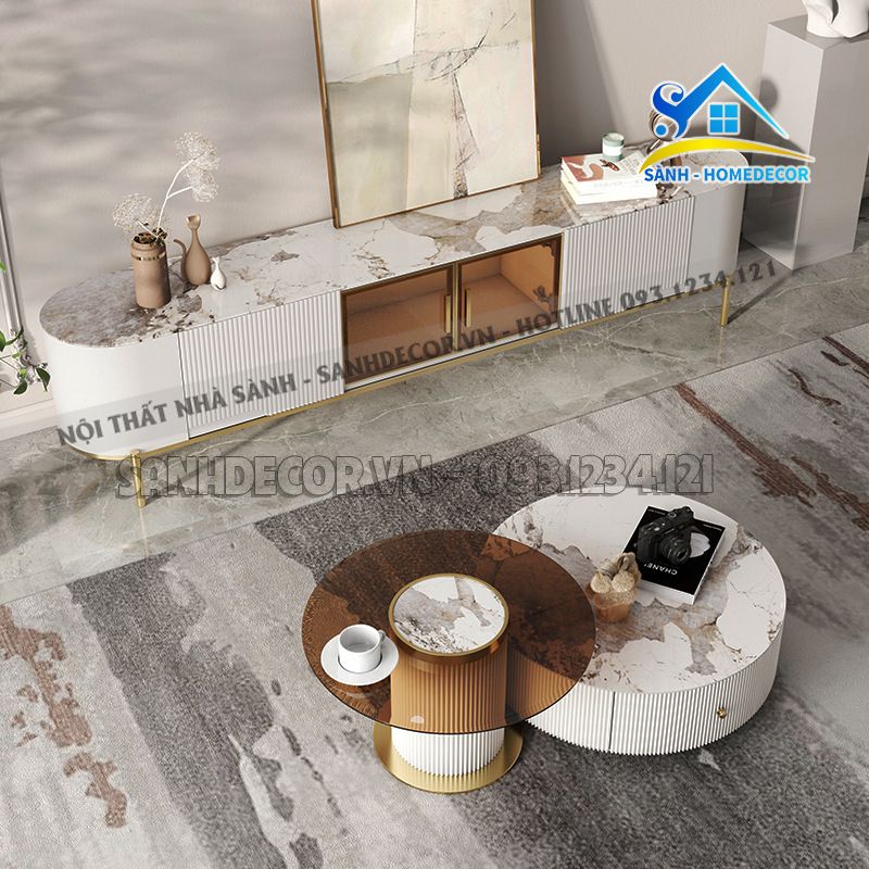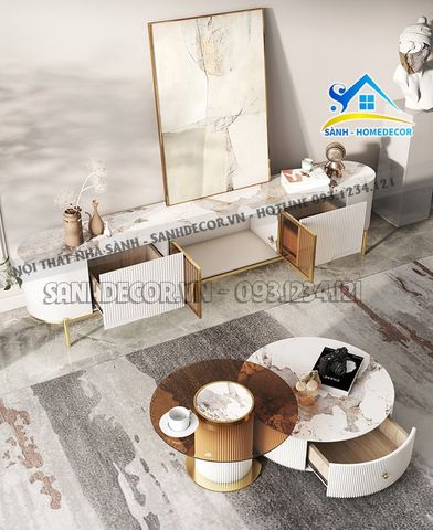 | Kích thước | 1. Kệ tivi: L200XW40XH46 cm 2. Bàn trà mặt kính: D80XH40 cm 3. Bàn mặt đá: D70xH30 cm |