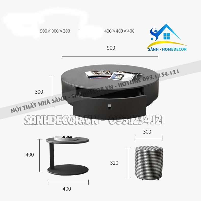 | Kích thước | 1. Kệ tivi: L260XW40XH35 cm 2. Bàn trà to: D90XH30 cm 3. Bàn chữ C: D40XH40 cm 4. Đôn ngồi: D30XH32 cm |